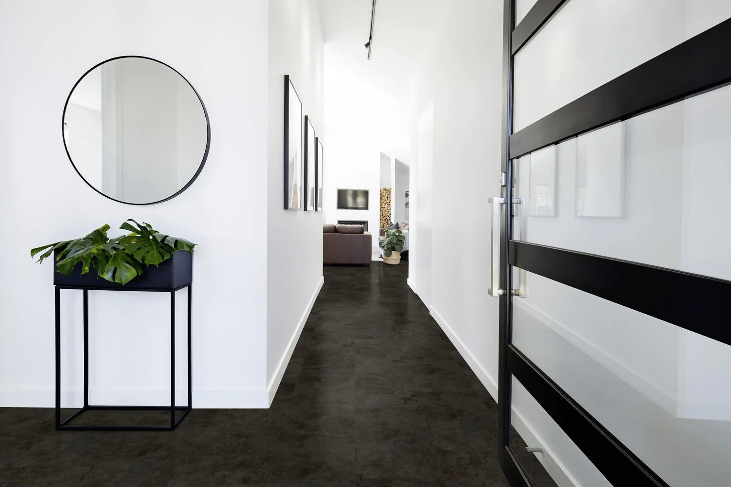 Dieses Produkt entdeckenDie dunkle Schieferoptik macht den schmalen Flur zum stilvollen Hingucker. Das stabile Vinyl hält den täglichen Beanspruchungen im Eingangsbereich stand und hemmt dabei Gehgeräusche.