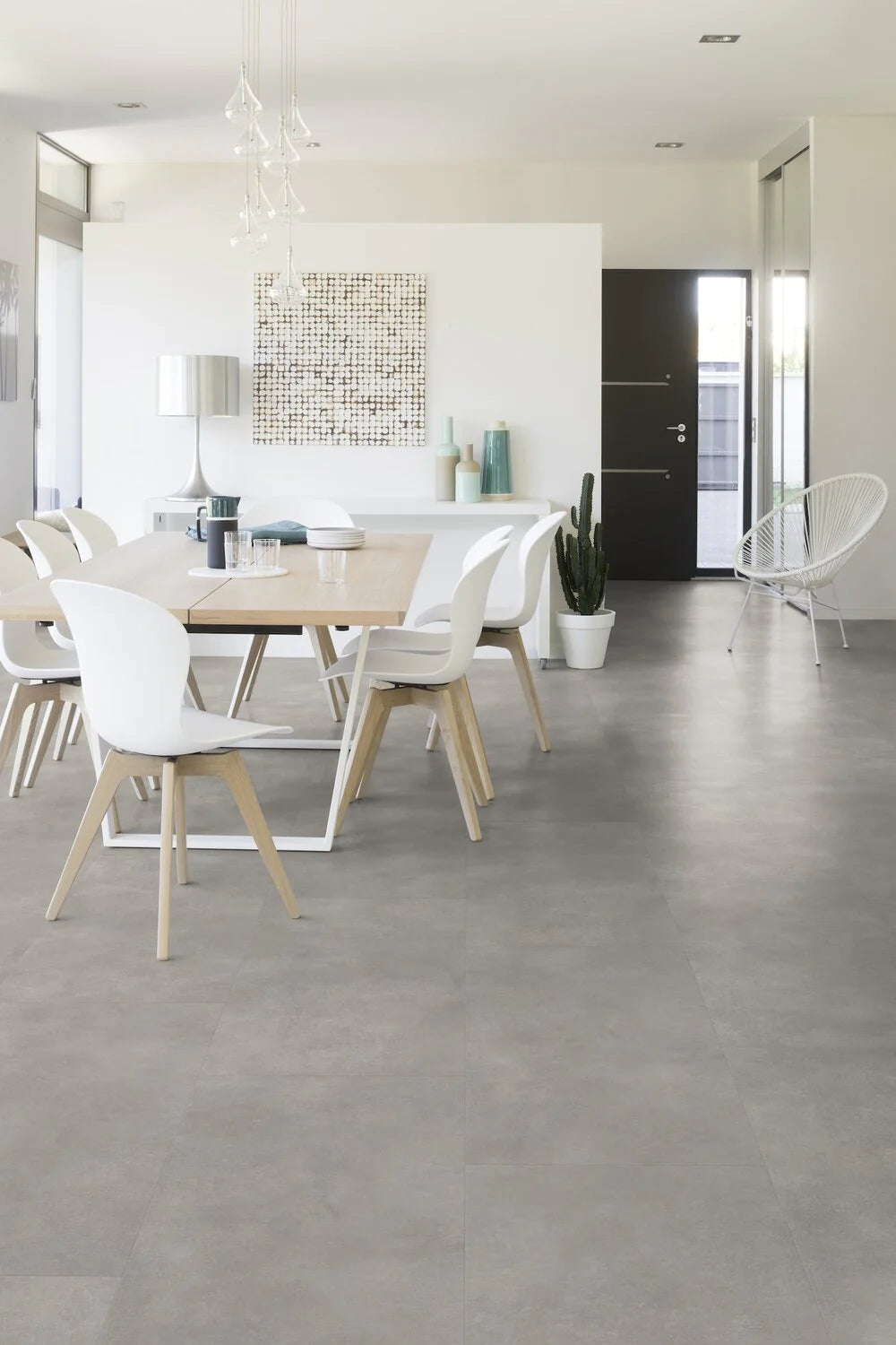 Vorherrschendes Material für Wände und Böden ist bei diesem Wohnkonzept Zement und Beton. Gegossen oder als Fliesen ist dieser Kunststein jedoch aufwendig in der Verlegung und in der Pflege. Die offenporige Oberfläche nimmt Feuchtigkeit auf und lässt schwer entfernbare Flecken entstehen. Daher bedarf es einer regelmäßigen Imprägnierung und Versiegelung. Als Alternative wurde in diesem beeindruckenden Wohnbereich auf Klickvinyl in ultramatter Steinoptik zurückgegriffen. Mit einer stabilen Basisplatte, einer dicken Schutzschicht und integrierter Trittschalldämmung kann nichts dem Boden anhaben. Weitere Pluspunkte: Sogar Anfänger können ihn mühelos verlegen und sich über einen wärmeisolierenden, komfortablen und pflegeleichten Fußboden freuen.