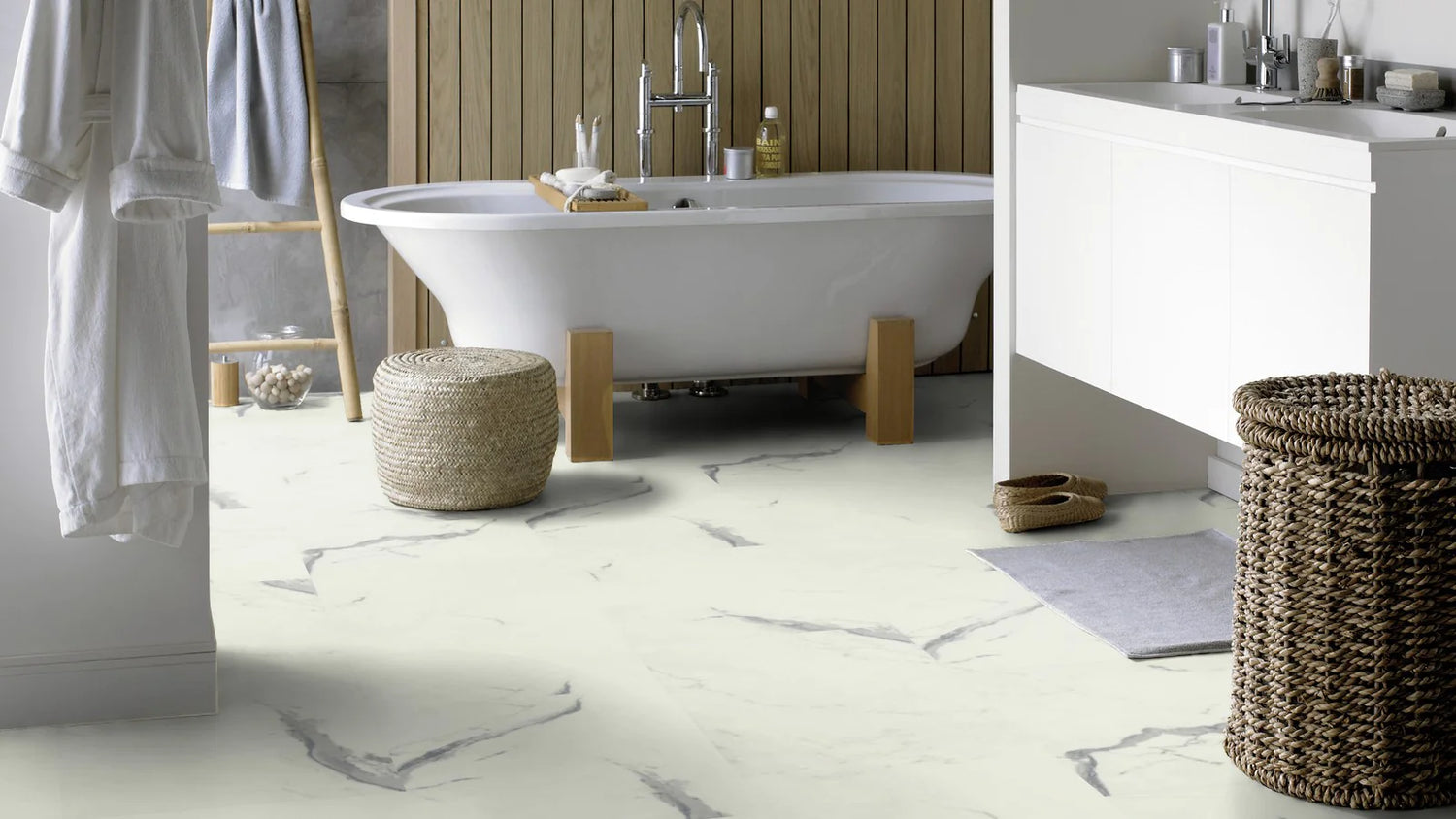 Ein Badezimmer mit edlem Marmorboden – ein Wunsch, der sich nicht jeder erfüllen kann. Hier hat sich jemand für eine smarte Alternative entschieden: Vinylboden in Marmoroptik. Chic und luxuriös rundet er das elegante Wohnkonzept ab, während er zeitgleich wasserresistent, fußwarm und pflegeleicht ist. Dies ist im Badezimmer besonders wichtig, da Marmor hier empfindlich auf hartes, kalkhaltiges Wasser reagieren kann. Echter Marmorboden ist außerdem eher kalt und kann im feuchten Zustand sehr rutschig werden.
