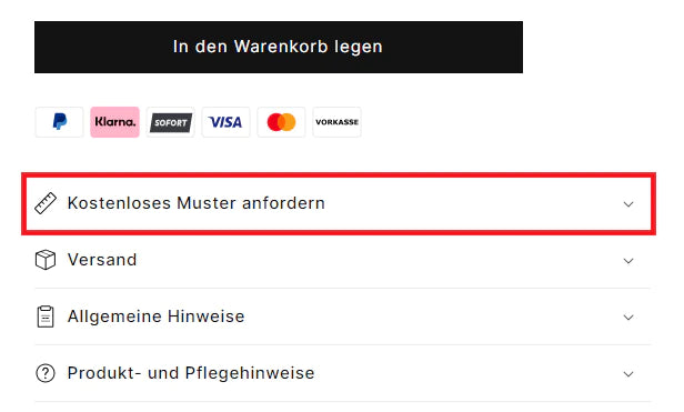 Das Bestellformular für die kostenlose Musterbestellung finden Sie auf jeder Produktseite unter dem schwarzen "In den Warenkorb legen"-Button.