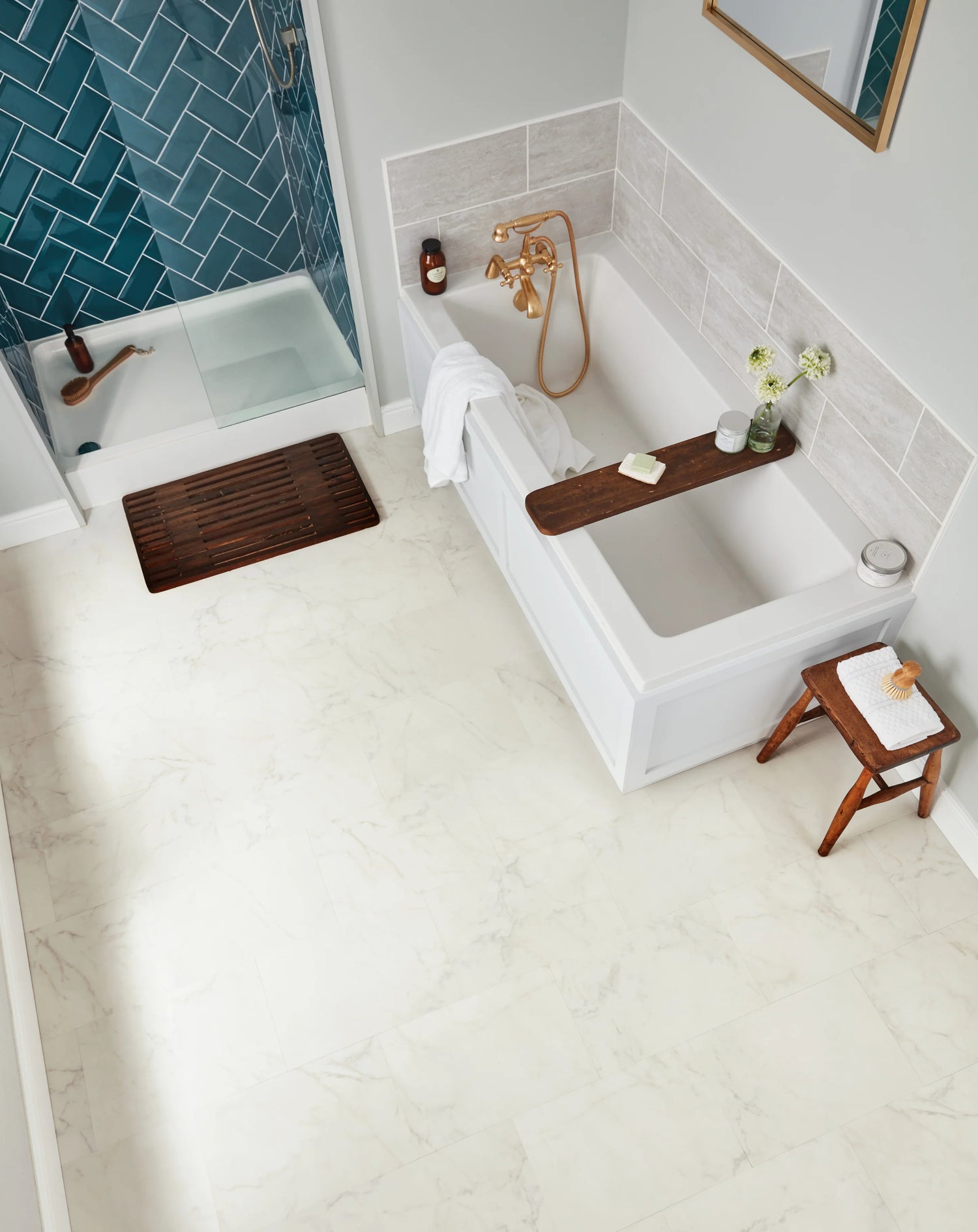 Mit dem Rigid-Vinylboden in Marmoroptik wurde mühelos ein sehr robuster Bodenbelag verlegt, der einen luxuriösen Charme in dieses Badezimmer zaubert.