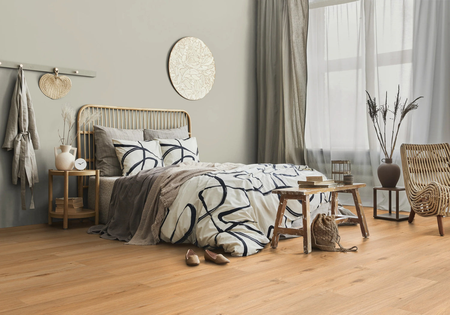 Die warme honigfarbene Holzoptik des Vinylbodens unterstreicht den gemütlichen Charakter und die natürlichen Materialien in diesem Schlafzimmer.
